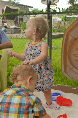 Ruby is actually two days younger than Spencer AND lives literally right down the street, also on Vine. I met her mom Amy through my moms group and so wish we knew each other sooner. Come to find out, she also went on bed rest at 35 weeks. We could've totally kept each other company during that time and maternity leave, and the kids could've also beeeen hanging out. We're just happy to have finally met them and to be having regular play dates. Last night was Spence and Ruby's first dinner date and they were hilarious. We hung out in their backyard, chatted it up with Ruby's super cool parents, and enjoyed the beautiful weather Tropical Storm Isaac seems to be bringing in.